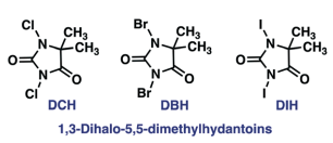 – Dimethyl hydantoin derivatives such as DBH, DCH, DIH have been used as benign reagents