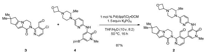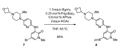- Development of an Efficient Manufacturing Process for Reversible Bruton’s Tyrosine Kinase Inhibitor GDC-0853 (OPRD, 2018) – (a) BPin syn: 120 Kg batch (Br compd) and B2pin2 (105 Kg) are used; (b) Suzuki coupling: 74 Kg (Cl compd) and Bpin compd (122 Kg), Pd cat. (1.74 Kg Kg) are used.