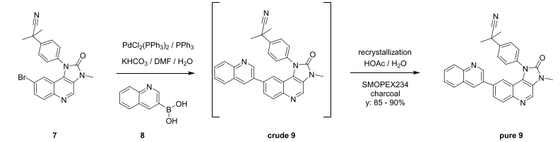 - Development of a Robust Synthesis of Dactolisib on a Commercial Manufacturing Scale (OPRD, 2017) – 155 Kg batch (Bromo derivative), Boronic acid (70 Kg) and Pd cat. (0.78 Kg) are used